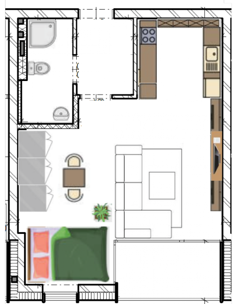 ,pokoj bez balkonu, kuchyň s vybavenou kuchyňskou linkou , koupelna s vanou